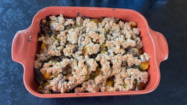 Temps de préparation : 30 min Temps de cuisson : 40 min Ingrédients pour 6 personnes : 1 poireau 1 carotte 1 gros oignon rouge ½ courge butternut 1 petit chou-fleur 1 panais ou navet 2 cuillères à soupe de sauce soja 1 cuillère à soupe d’huile d’olive 1 gousse d’ail Poivre Pour la pâte à crumble 100 …